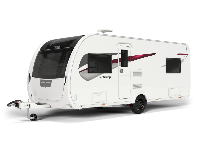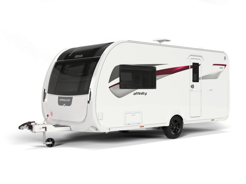 Affinity 520, de ideale reiscaravan totale lengte van slechts 660cm. Lange loungebanken en eenruime toilet/omkleed/doucheruimte.