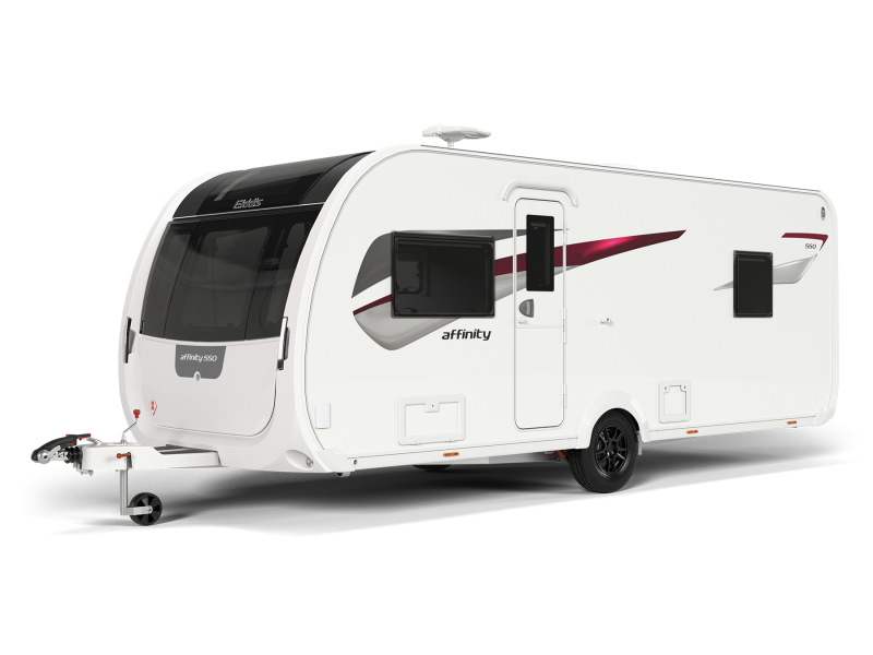 Affinity 550 heeft een uitschuifbaar eilandbed in de lengterichting, douche en toilet ruimte bevinden zich in het midden.